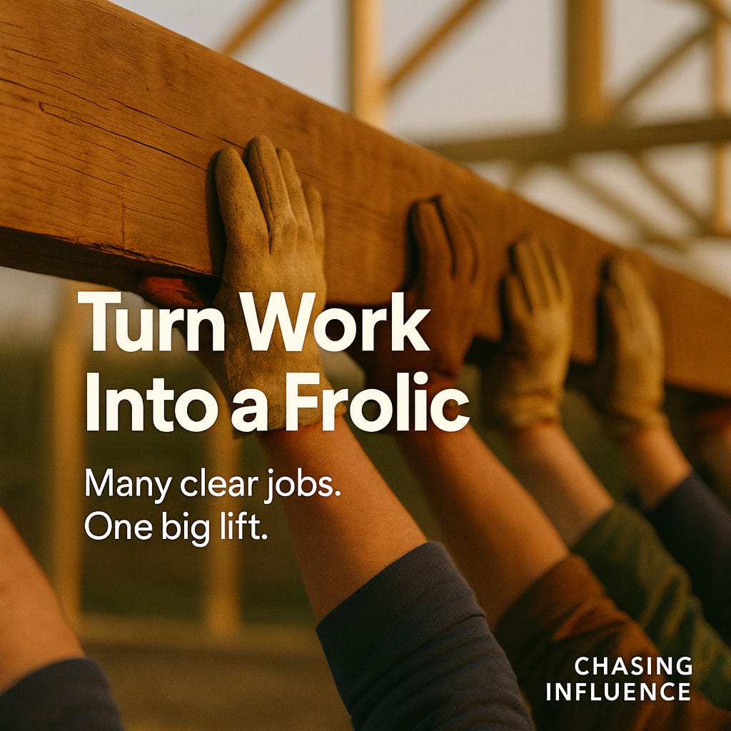 When the Amish raise a barn, they call it a frolic. A frolic is a shared job that blends social time with a clear, practical shared mission. It’s mutual aid in motion. And it’s fun! Embracing this approach to work and mindset shift could help any group as it takes on a challenging project.
